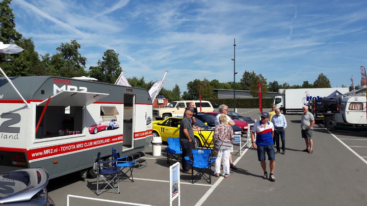 De zondag konden we wat later starten omdat we de caravan hadden laten staan en daar de witte buizen show in hadden opgeborgen. Na het opbouwen wilde we de koffie gaan zetten en daar kwam Erik Versteeg aan die wat later was dan afgesproken. Iedereen dacht dat hij in zijn fraaie AW11 Charger zou komen maar helaas had buienrader roet in het eten gegooid, en kwam Erik met zijn blauwe SW20 aan rijden.
